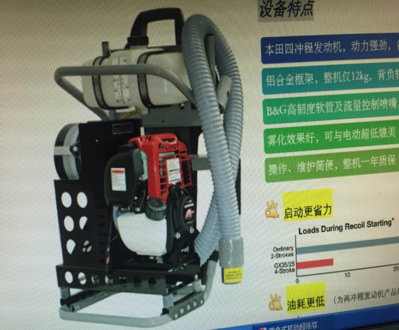 由四冲程发动机、压缩风机、传动总成、药箱、喷洒系统和支架等部份组成。功效高,重量轻,药耗少,喷幅宽,射程约10米远,雾粒直径在30微米,使用方便;适合于室外空间喷雾。