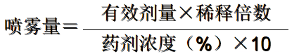 喷雾量是决定杀灭效果的关键环节。比如:用2.5%溴氰菊酯可湿性粉剂滞留喷洒控制蟑螂,通常要求施药的有效剂量是12.5mg.ai/m2 ~ 25mg.ai/m2,如果稀释100倍的话,则每平方米需喷稀释药液50ml~100ml;如果稀释10倍的话,则每平方米只需喷稀释药液5ml~10ml。可见,喷雾量是与药剂的浓度、施药的有效剂量和稀释倍数密切相关,其之间的关系可用下式表示: